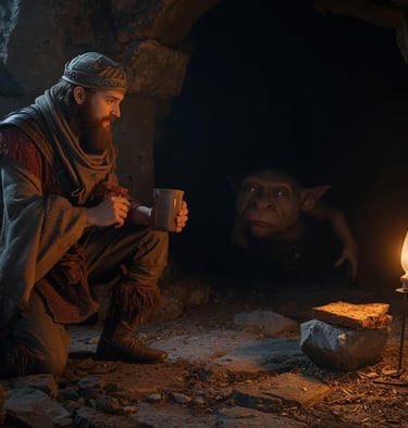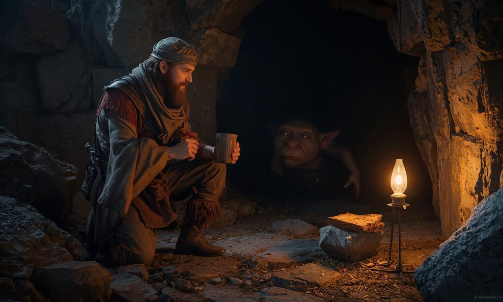 D’improvviso, il vento cambiò. Un colpo secco risuonò dietro di loro. Dalle ombre emerse una figura minuscola, alta quanto un bambino, ma dal volto vecchio e scavato. Indossava una tunica logora e portava con sé una lampada fatta di quarzo.