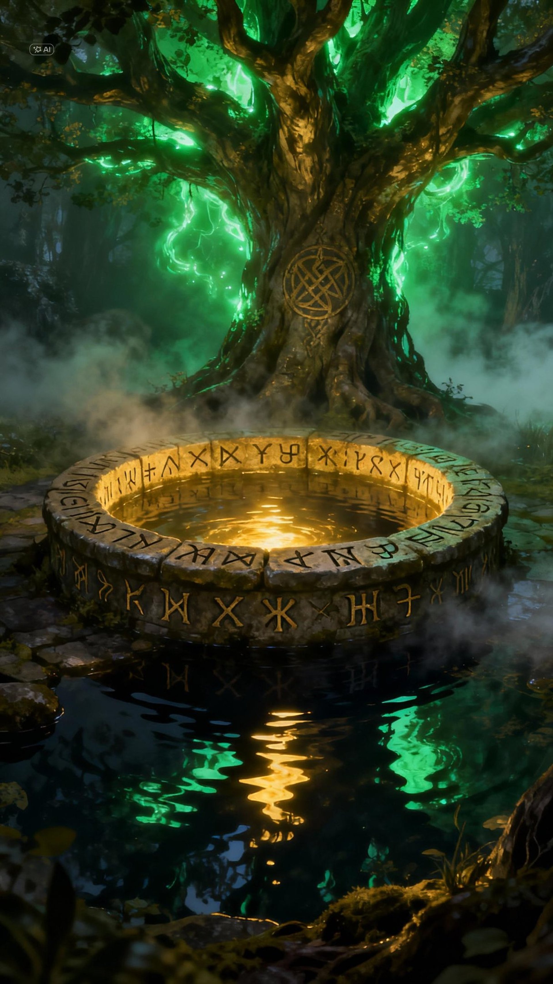 Sotto le radici di Yggdrasill, l’occhio di Odino brilla ancora nelle profondità del pozzo di Mímir — come una stella sommersa, che osserva silenziosa il fluire del tempo.